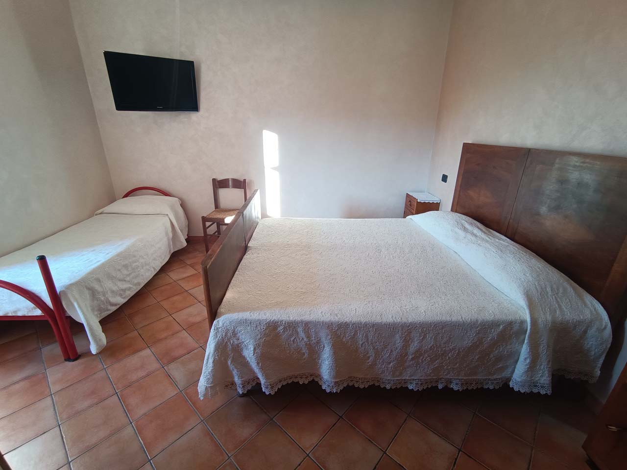 La camera è arredata con gusto, combinando elementi rustici e moderni per creare un’atmosfera rilassante. Al centro della stanza si trova un letto matrimoniale spazioso e confortevole, con un materasso di alta qualità che garantisce un sonno riposante. Accanto, un letto singolo completa l’area notte, permettendo alla camera di trasformarsi da doppia a tripla senza sacrificare lo spazio vitale. I mobili in legno naturale e i tessuti dalle tonalità calde creano un ambiente rustico ma elegante, ideale per chi cerca relax dopo una giornata di esplorazioni.